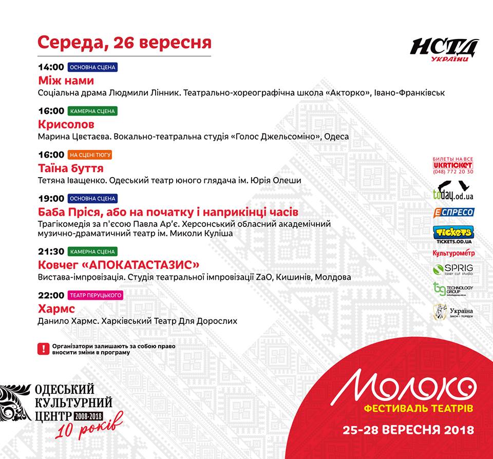 25-28  вересня 2018 в Одесі пройде 11-й фестиваль театрів “Молоко”.