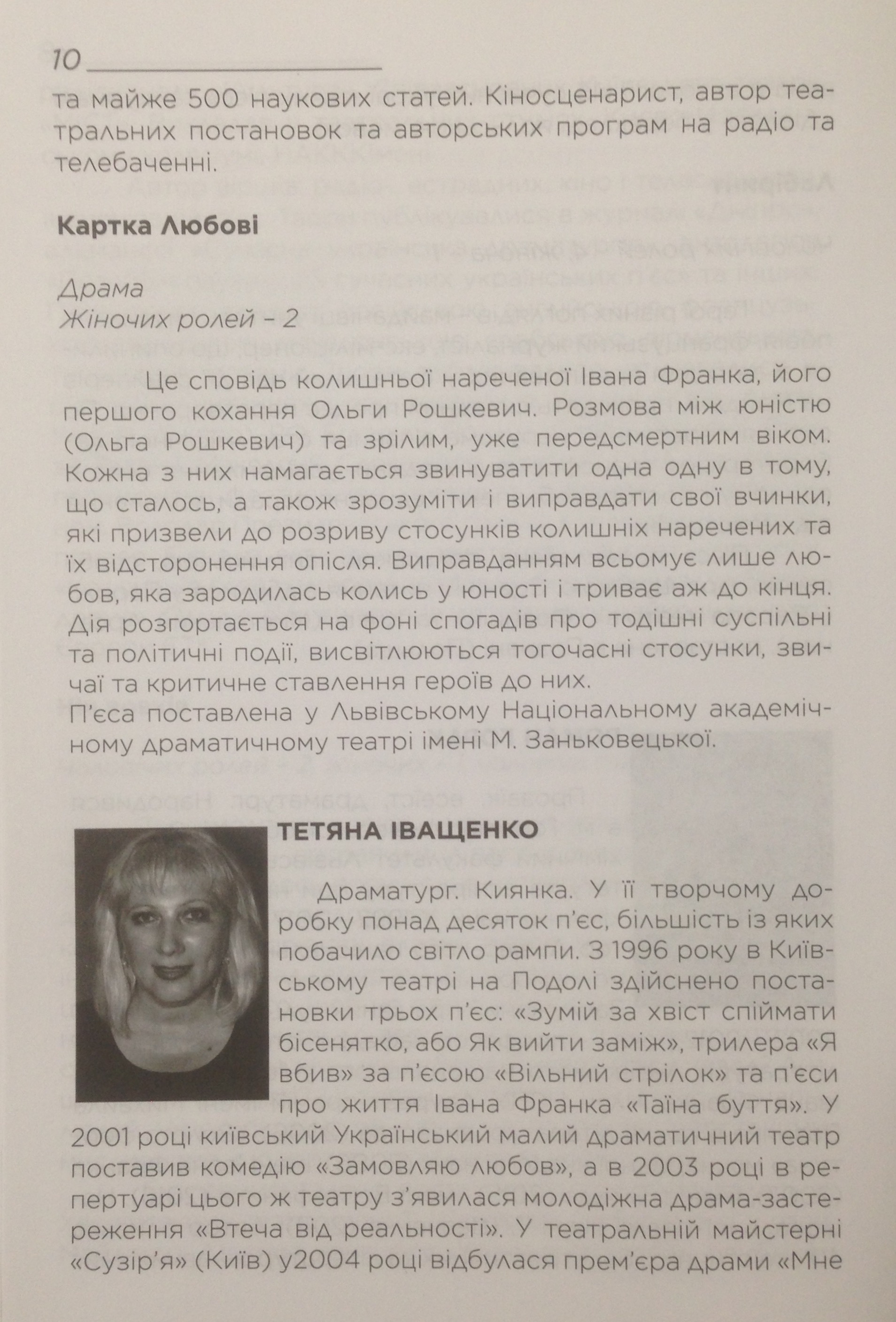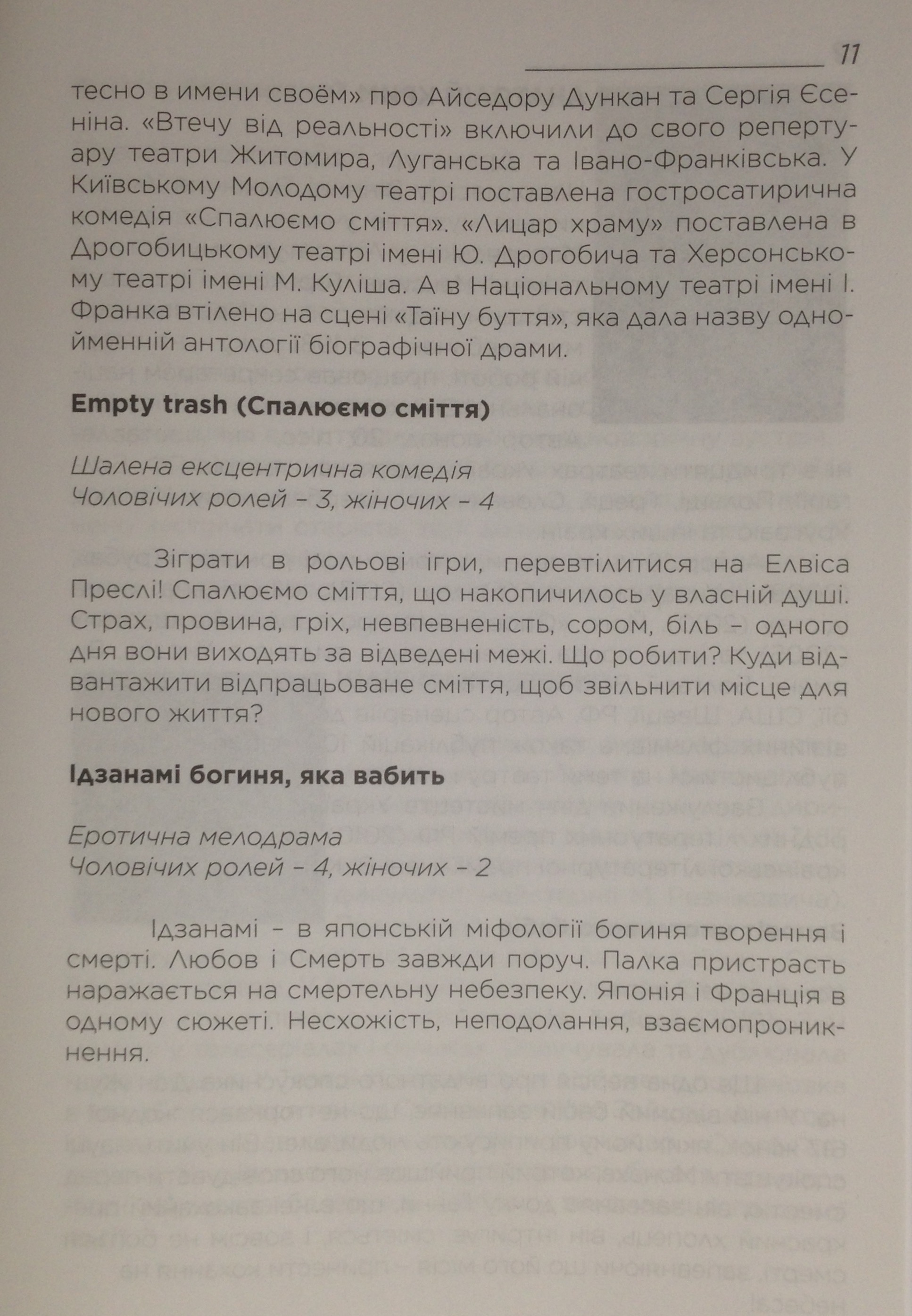 “Коло авторів”. Збірник анотацій п’єс сучасної драматургії. Випуск №1. Київ, 2017. Опубліковано 07.12.201727.05.2018 від Lidiya В Києві вийшов збірник анотацій п’єс сучасної драматургії “Коло авторів”. Творчість Тетяни Іващенко представлено п’єсами “Empty trash (Спілюємо сміття)” та “Ідзанамі богиня, яка вабить”.