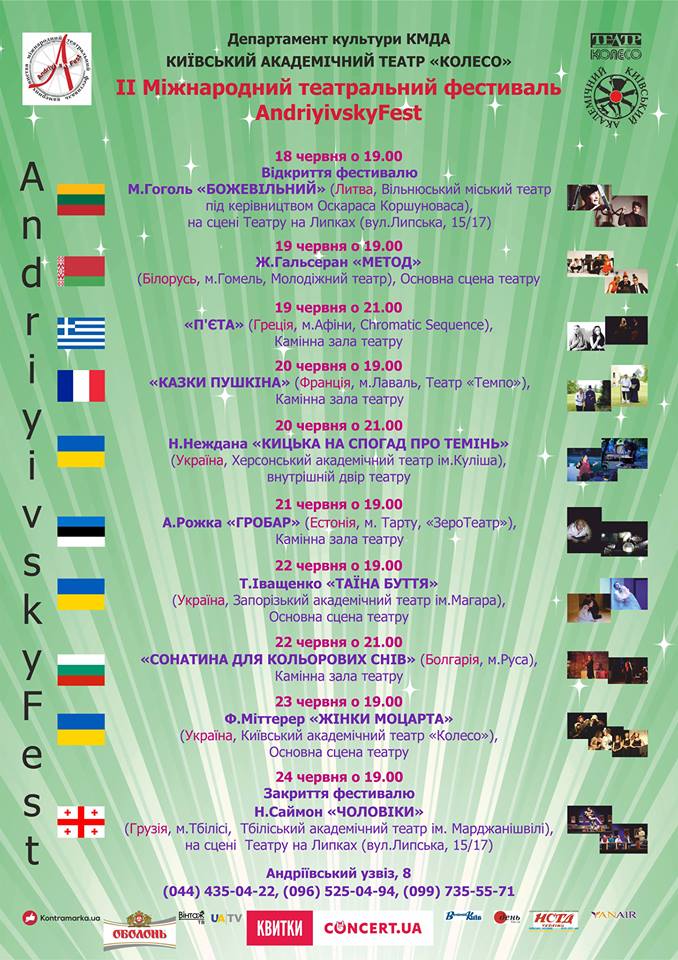 Ще зовсім молодий ІІ Міжнародний театральний фестиваль AndriyivskyFest18-24 червня запрошує до перегляду камерних вистав театрів країн СНГ та Європи. Фестиваль заснований Іриною Кліщевською –директор театру “Колесо” – та відбувається на сцені цього ж театру. Цьогоріч у фестивалі візьме участь 8 країн, серед яких Франція, Грузія, Греція, Литва, Естонія, Болгарія, Білорусь і, звісно ж, Україна.Одна з головних театральних подій Києва, з одного боку, брендує “місце дії” – Андріївський узвіз — історичний центр столиці, а з другого — розширює театральну карту. Вибір саме камерних вистав пояснюється 2 тезами: