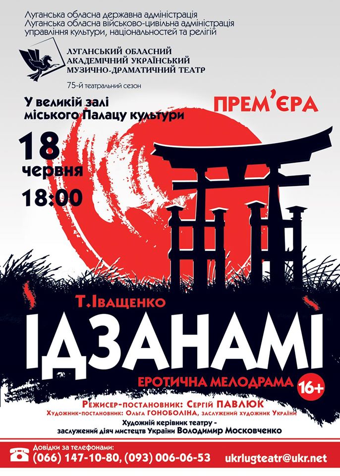 2016 – “Ідзанамі”. Режисер-постановник – Сергій Павлюк, головний режисер Херсонського обласного академічного музично-драматичного театру ім. Миколи Куліша. У виставі задіяні актори театру: Анастасія Леміш, Олександр Михайлов, Дарина Штомпель, Денис Пономаренко, Ярослав Грошев, Іван Шморгунов. Вистави театру проходять на сцені міського Палацу культури (м.Сєвєродонецьк).