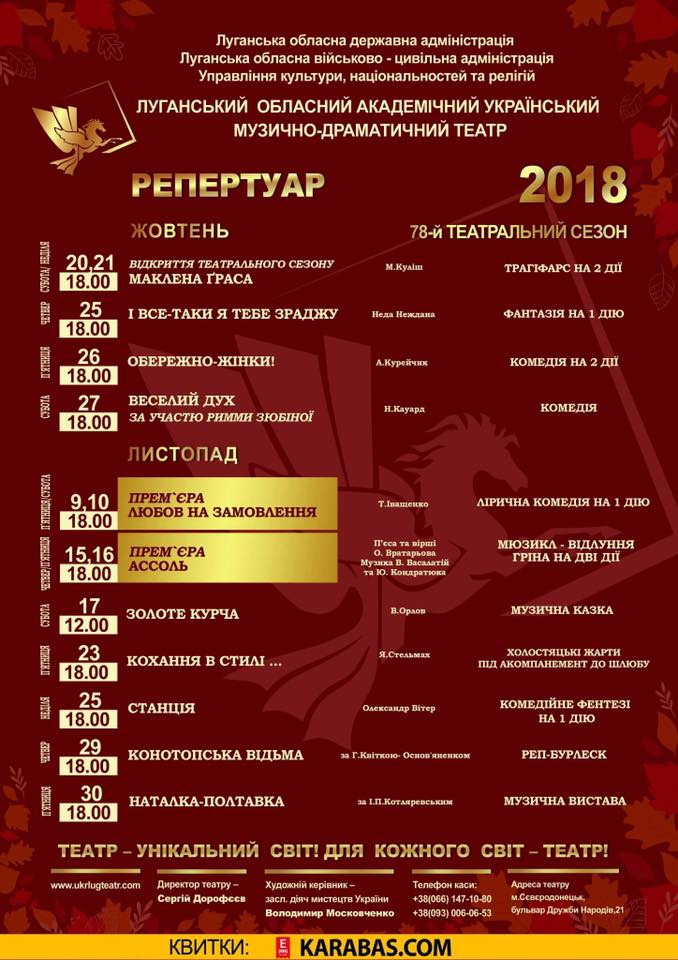 Луганський обласний академічний український музично-драматичний театр ( з 2015 року вистави театру проходять на сцені міського Палацу культури м.Сєвєродонецька).