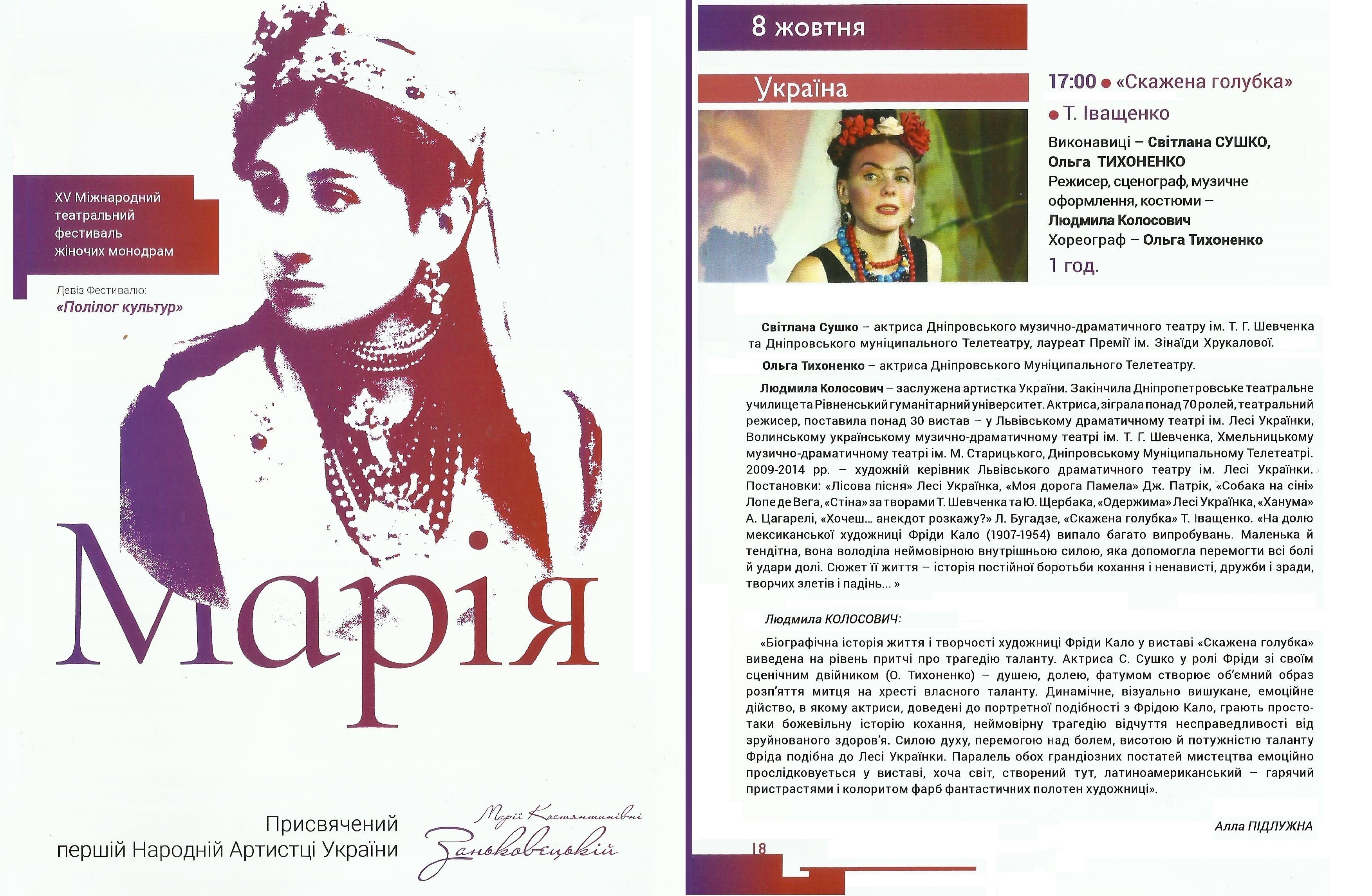 8 жовтня – вистава «Скажена голубка» Т. Іващенко, “Телетеатр”, м. Дніпро.